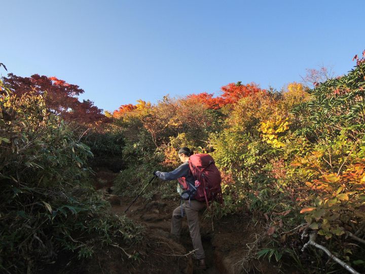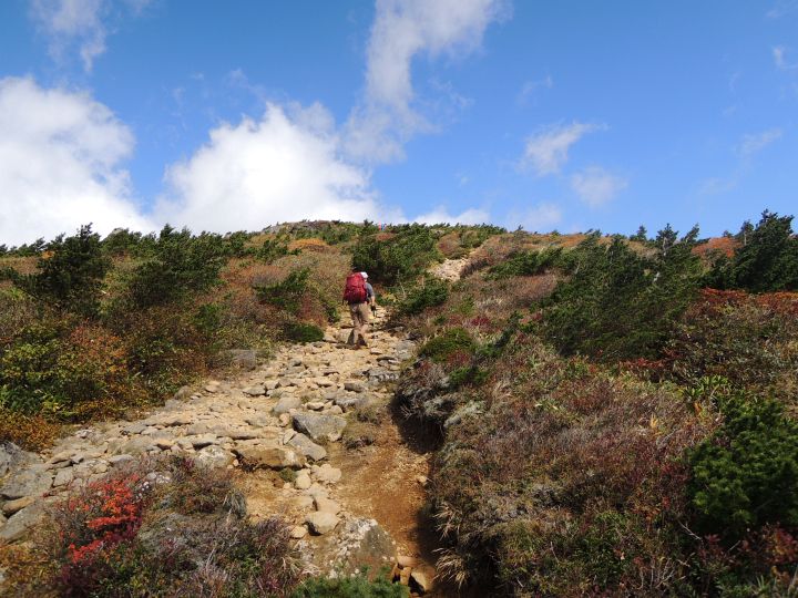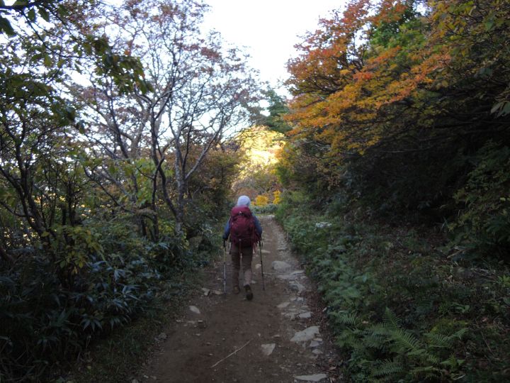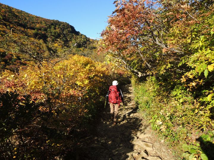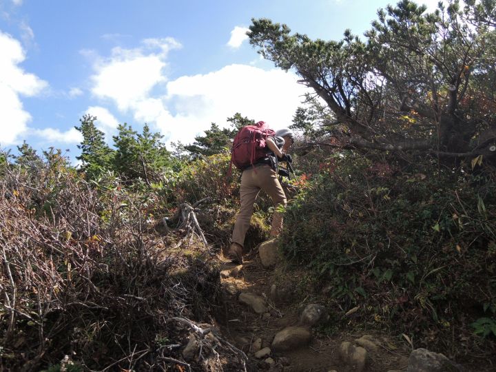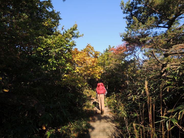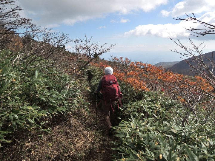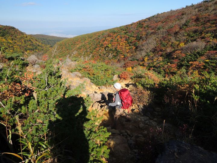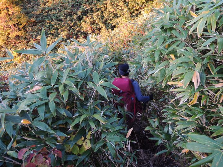 鮮やかに紅葉した潅木帯を進む。潅木が背丈以上に高くて、見晴らしのきかない場所が多かった。