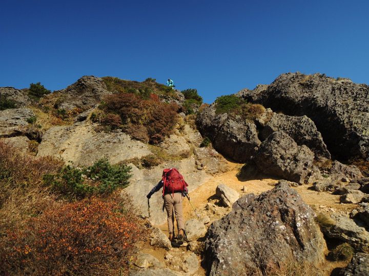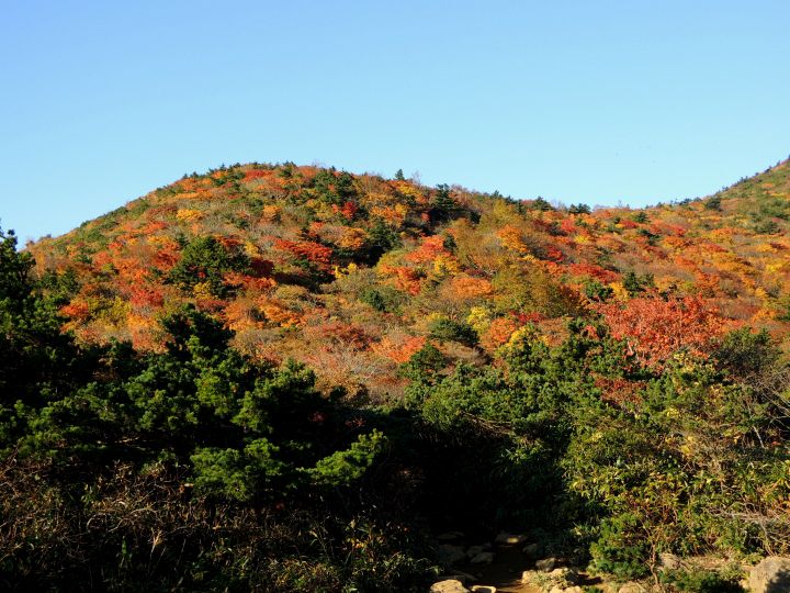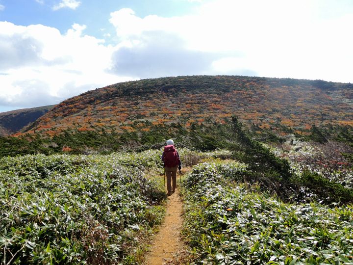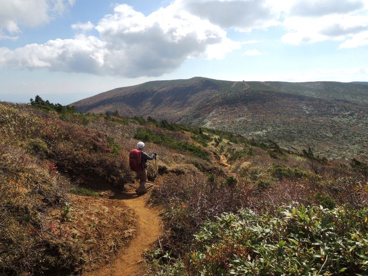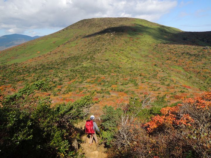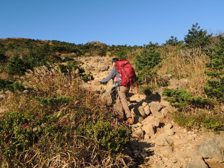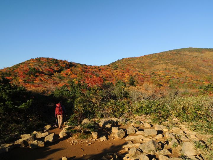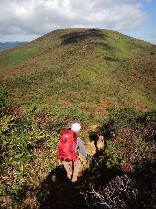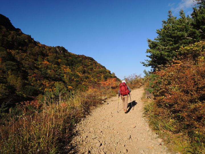 鮮やかに紅葉した潅木帯を進む。潅木が背丈以上に高くて、見晴らしのきかない場所が多かった。
