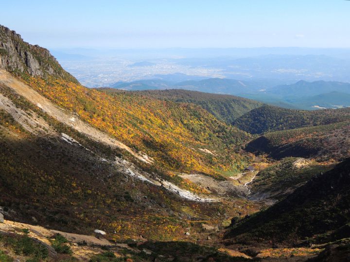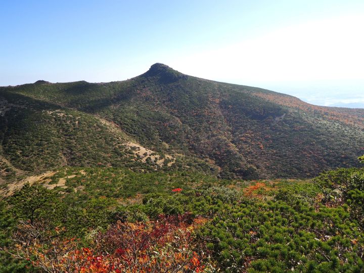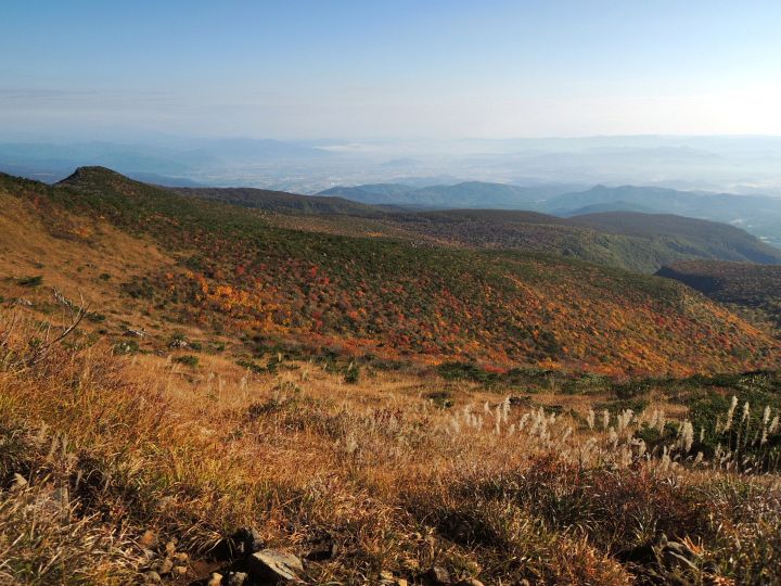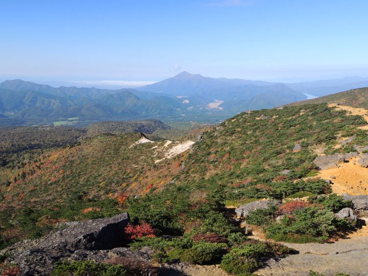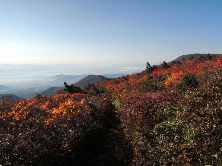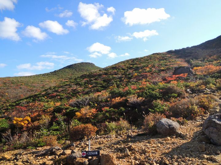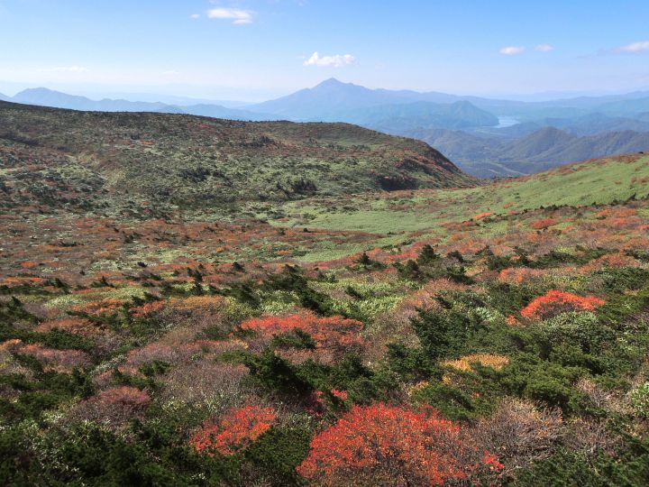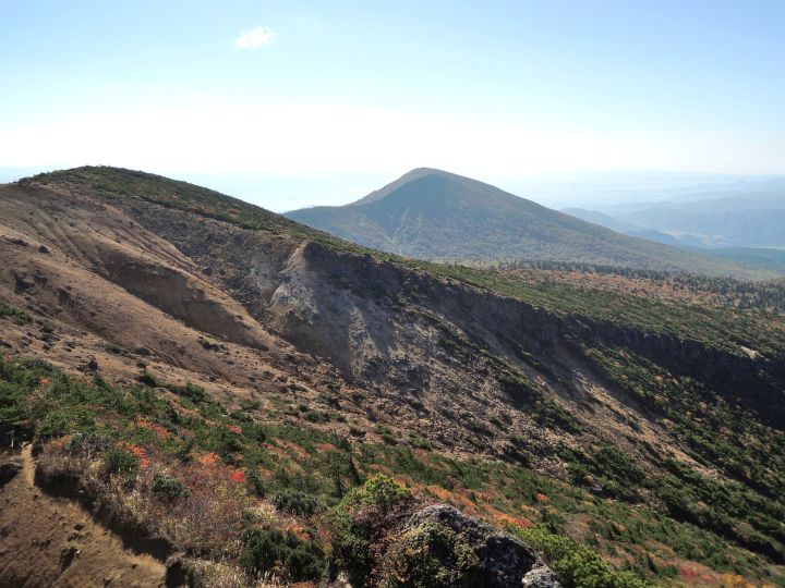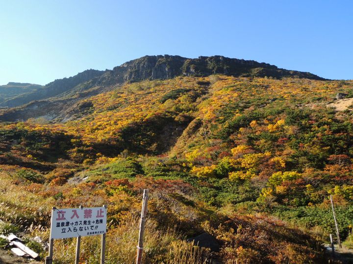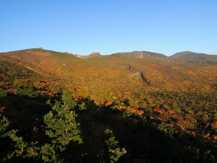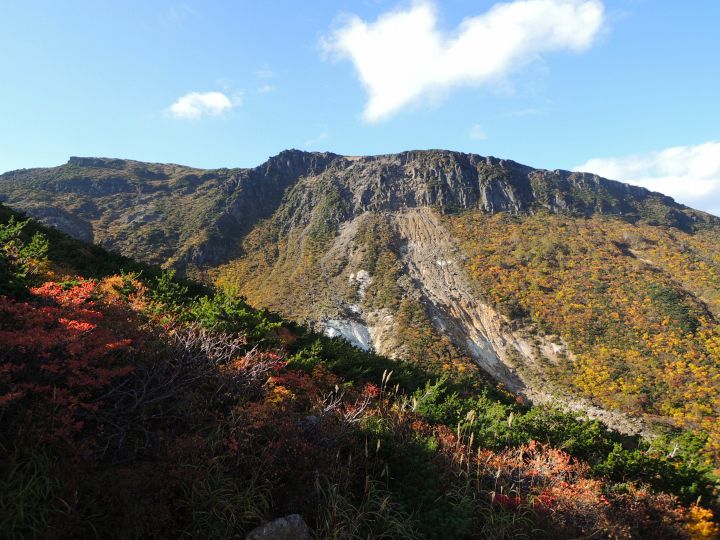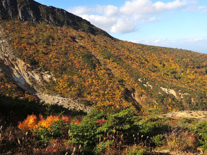 西側の斜面の紅葉。沼ノ平火口や鉄山周辺の荒々しさとは対照的な優美な景観。