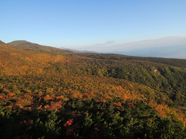 北側の眺め。朝陽が紅葉をより鮮やかな色彩にする。左は箕輪山で、その右奥には一切経山と吾妻富士。
