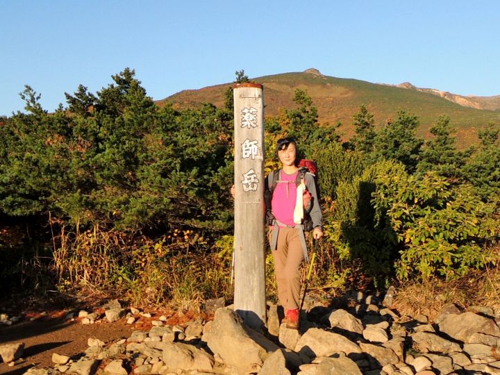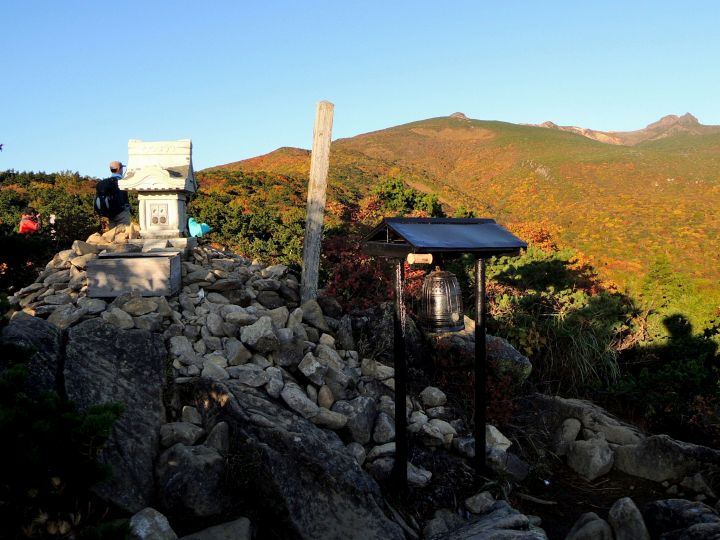 1時半起床、2時出発。4時45分にあだたら高原駐車場に到着した。奥岳登山口から薬師岳コースで山頂に出たが、安達太良山の東斜面一体が見頃を迎えた紅葉に鮮やかに彩られていた。山頂(乳首山)で360度の大展望を楽しみ、沼ノ平の荒々しい火口を横目にしながら変化に富む山頂稜線を船大明神、船明神山、矢筈森、鉄山、箕輪山と巡って、懐の深い安達太良山群の山歩きを終日堪能した。下山路のくろがね小屋周辺の紅葉も見事だったし、あだたら渓谷自然遊歩道も見どころが多くて思いのほか楽しめた。天気は快晴で紅葉は見頃、しかも山全体の景観が素晴らしく、これ以上ないほど素晴らしい山行となった。