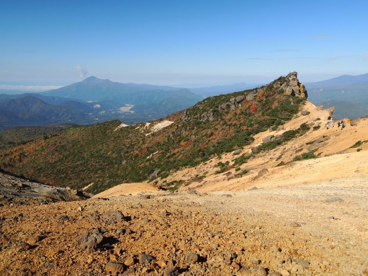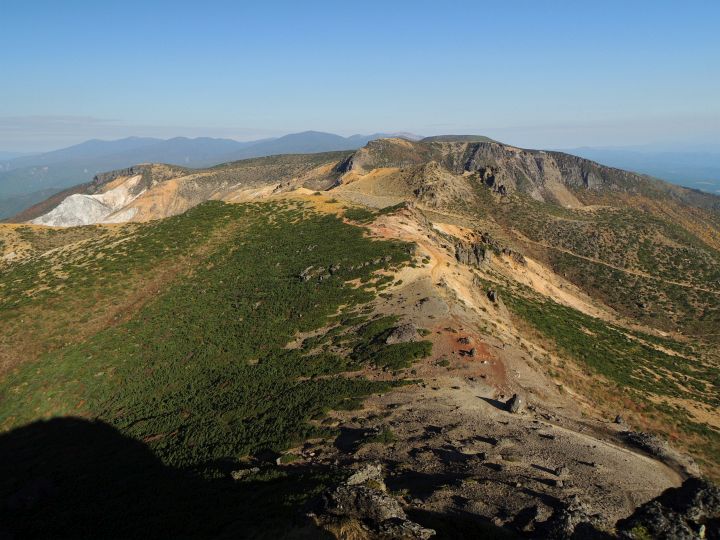 北側の眺め。山頂稜線の先に矢筈森と鉄山が縦に並び、鉄山の右上に箕輪山の山頂部がのぞいている。左端には硫黄の漂白作用で白くなった火口の一部が見えており、その上が胎内岩。そして左奥には吾妻連峰がずらりと並んでいる。