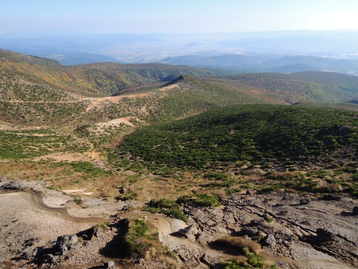 北東側。左から真ん中辺りの篭山へ延びる登山道がくっきり見える。その向こうは福島市。