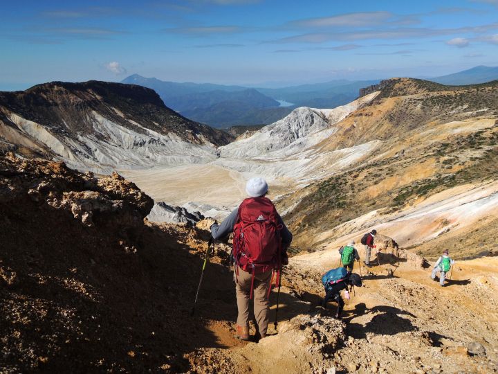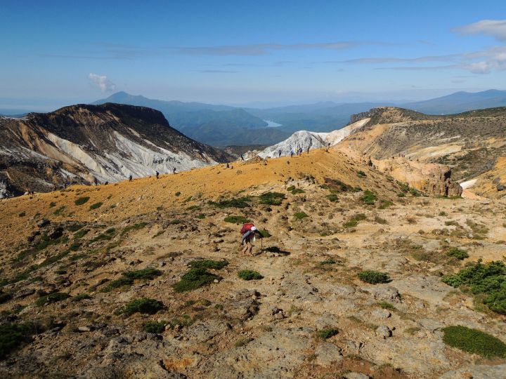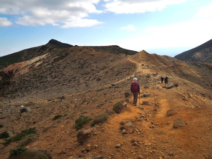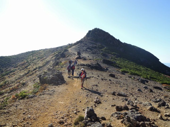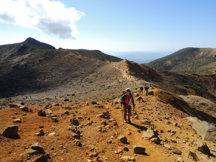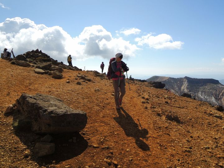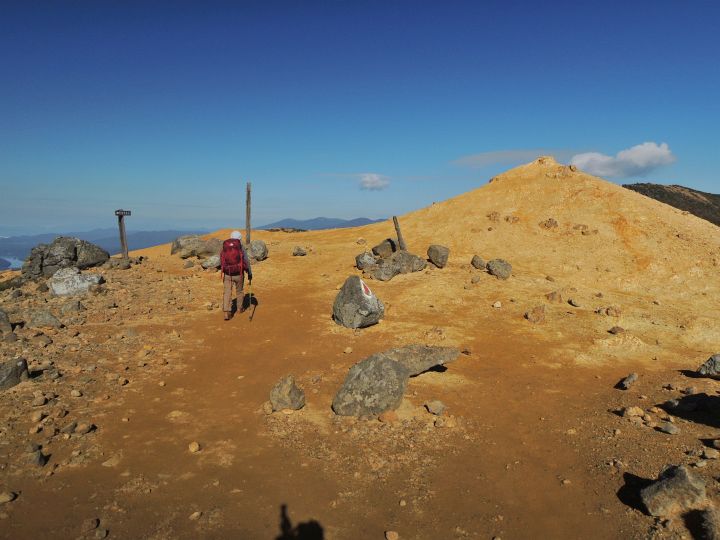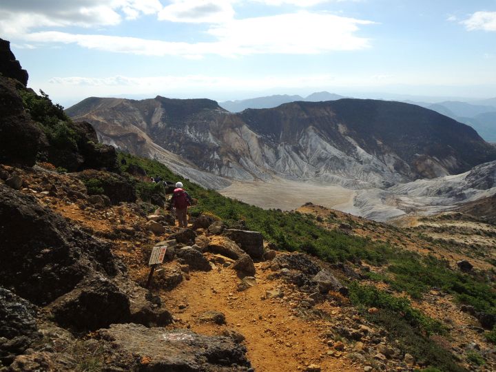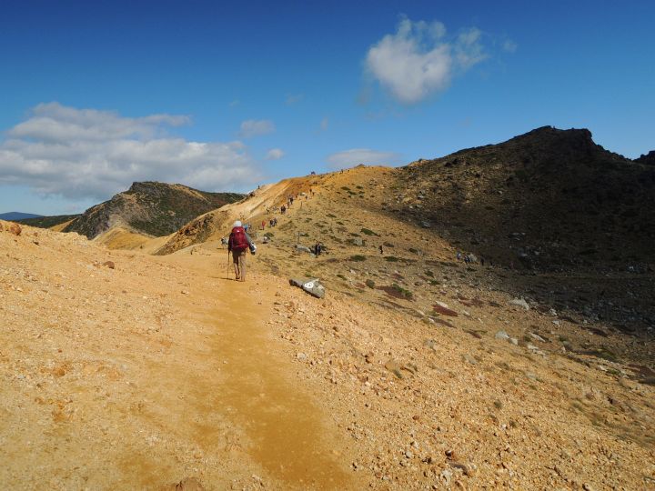午後になっても天気は最高。沼ノ平火口を右手に見ながら進む。