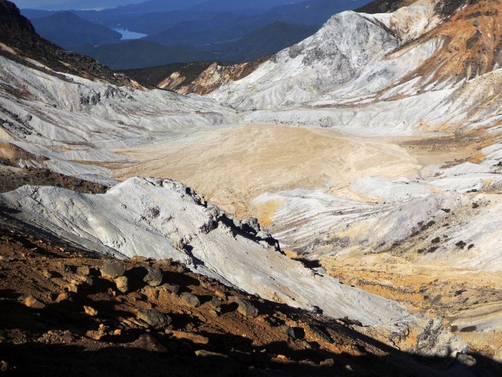 火口の底は真っ白な沼ノ平。左奥の岩壁が障子ヶ岩で、右奥が胎内岩。沼ノ平の向こうには秋元湖が見える。