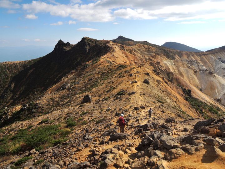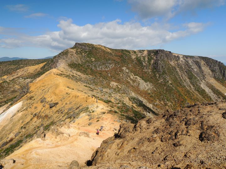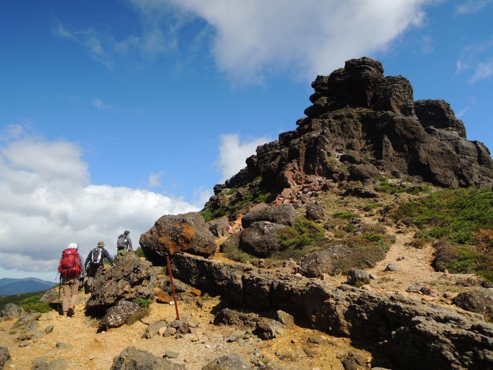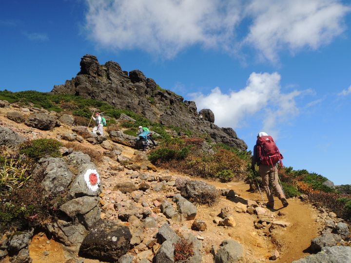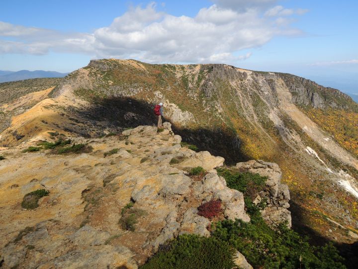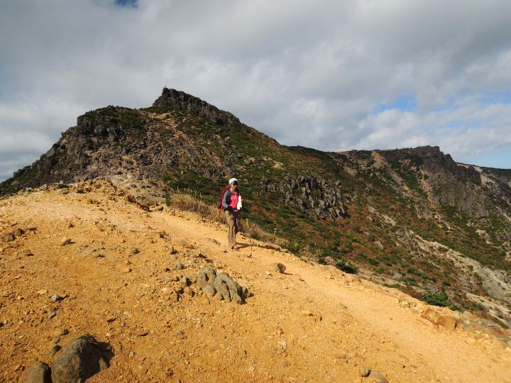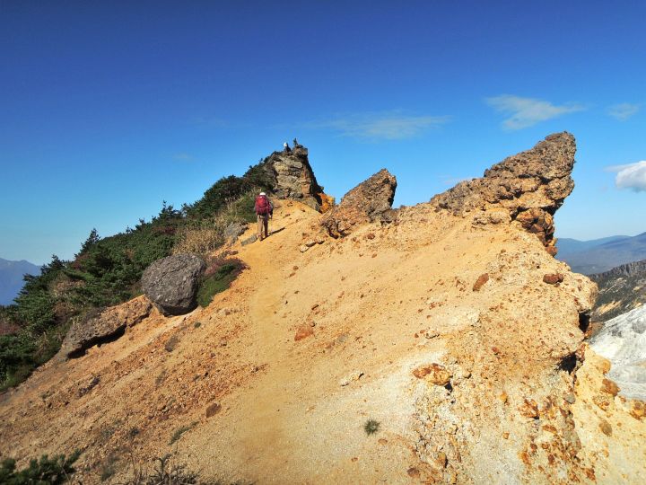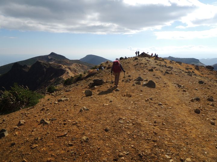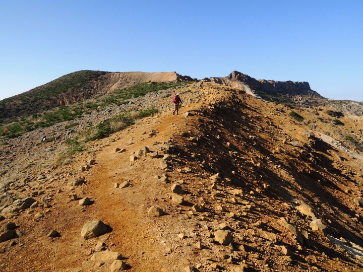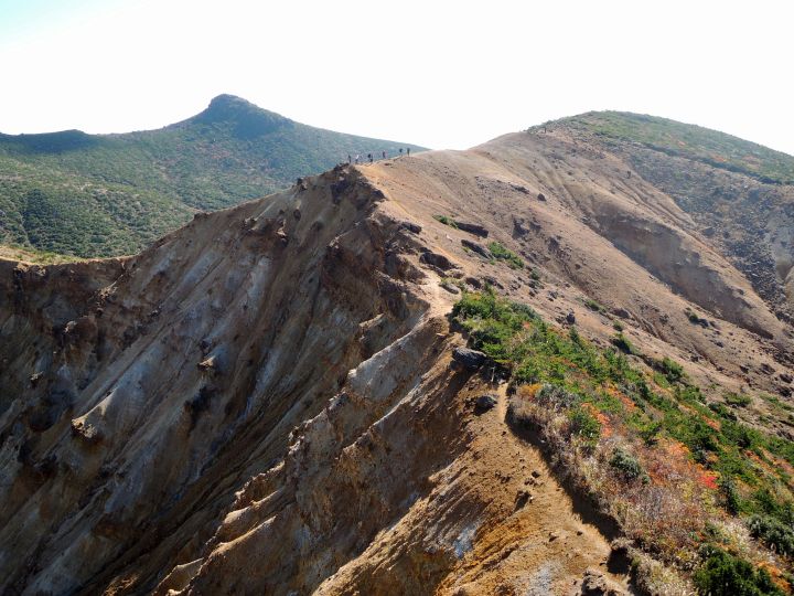 角のように岩が突出する火口の縁に沿って船大明神へ向かう。登山者2名の姿が見えた。