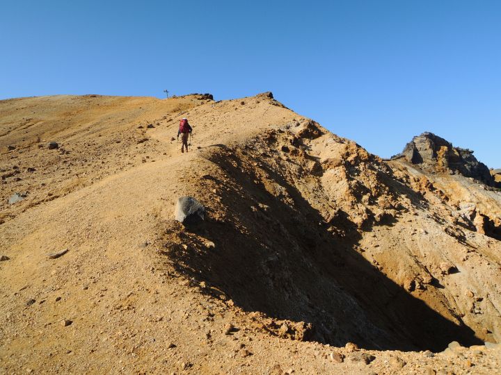 沼ノ平火口を何度ものぞきこみながら火口の縁を上った。南北に長い船明神山のピークは南側(左)にある。