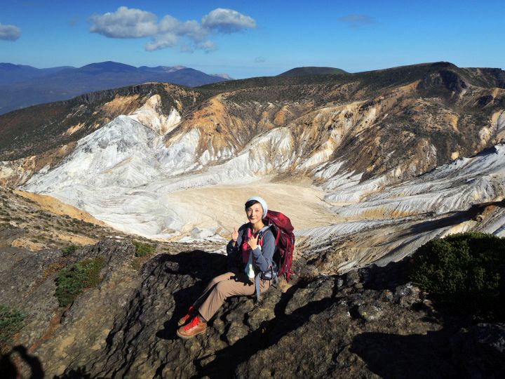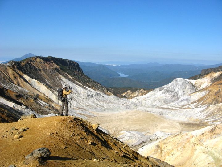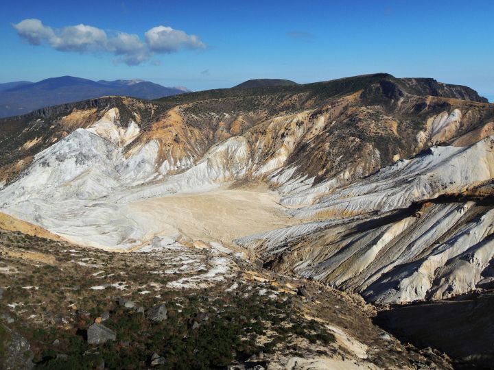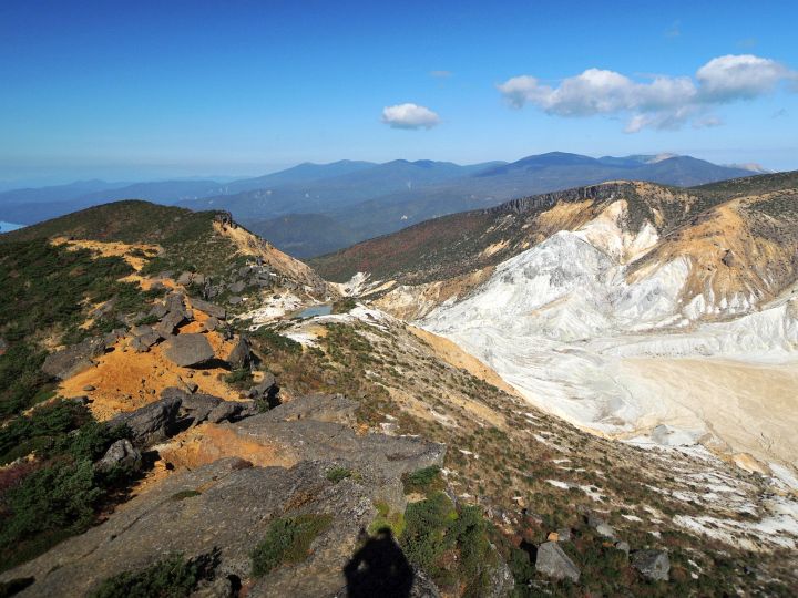 矢筈森から眺めた沼ノ平火口。輝くばかりに白い火口に赤茶けた土と黒々とした岩壁。遠く磐梯山も見えて、惚れ惚れするような景観の広がりに感じ入った。