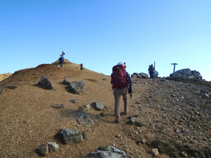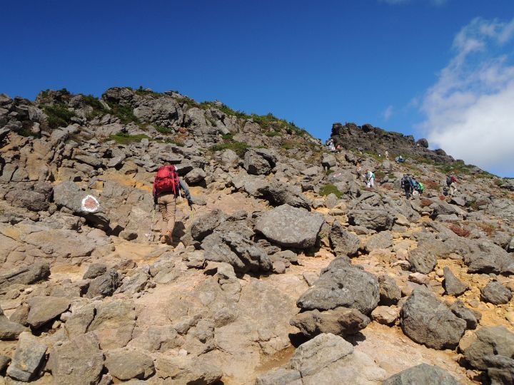 山頂直下の赤茶けたガレ場を上る。