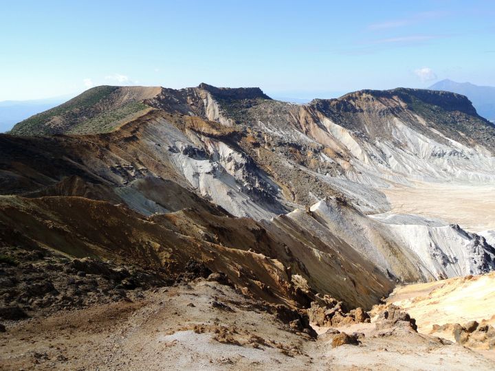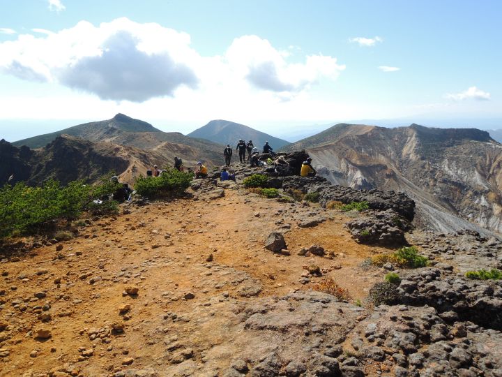 北側には沼ノ平火口。下まで降りて火口の底から周囲を見渡してみたいものだが、有毒ガスが出ていては諦めるしかない。