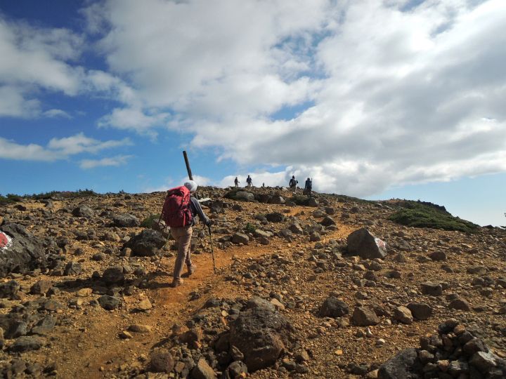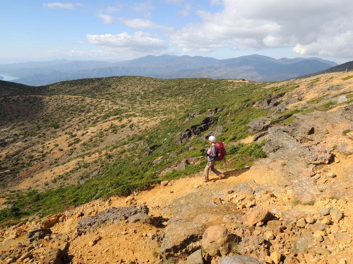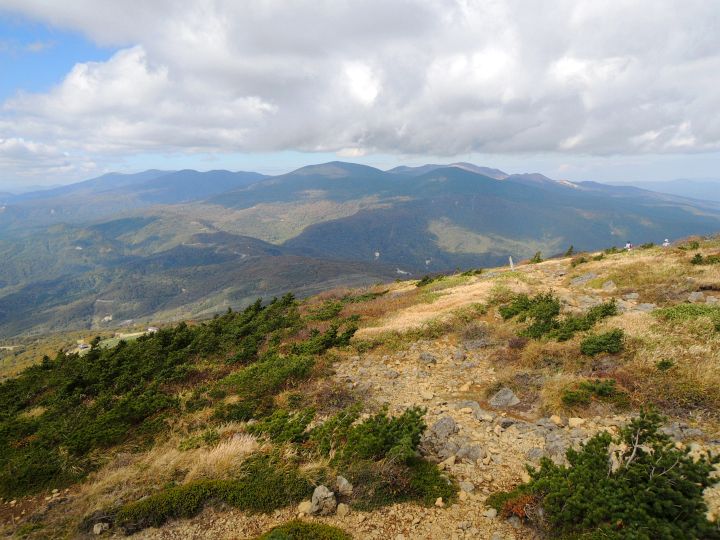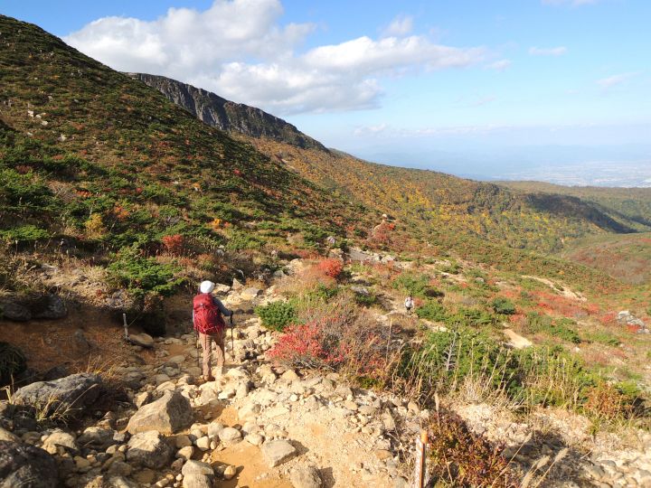 吾妻連峰と箕輪山を前方に眺めながら、広々とした稜線をゆるやかに下る。いつの間にか北の空に雲が湧き出ていた。