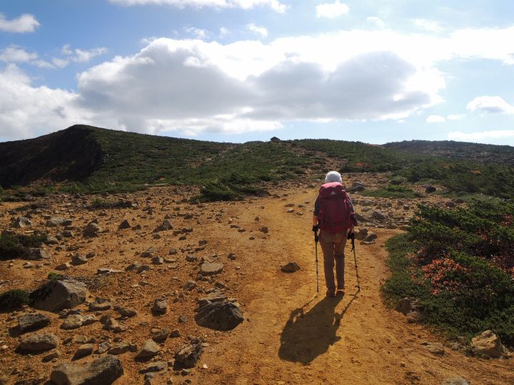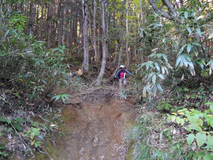 鞍部まで急坂を下る。避難小屋から1時間もかからないと思っていたが、それくらいはかかるかもと思い直した。