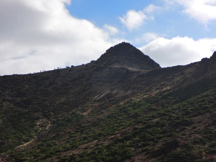 南側を見上げた先には乳首山。山頂付近に登山者の列が見えた。