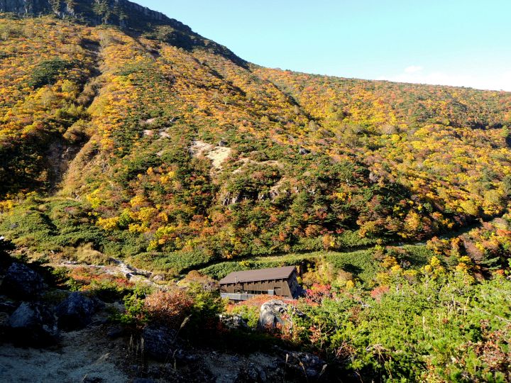 紅葉に彩られた斜面の下に、くろがね小屋が現れた。
