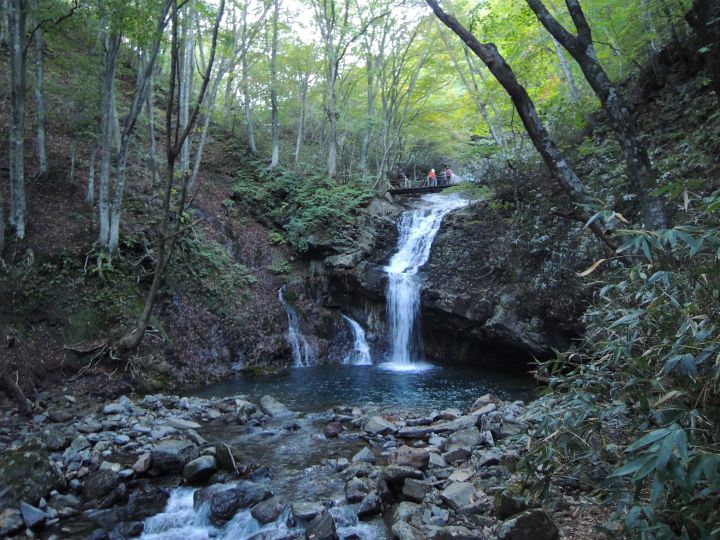 遊歩道は小さな滝や岩など、ちょっとした景勝が連続する。写真は「昇龍滝」。