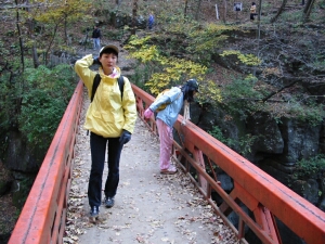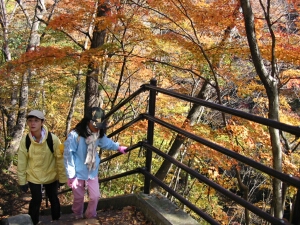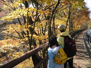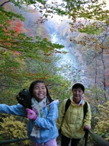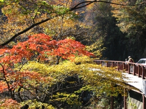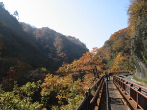 今週はあまり娘に無理をさせたくなかったので、軽いハイクが楽しめる紅葉最盛期の吾妻渓谷へ行ってきた。5時前に家を出て、7時半に現地到着。めずらしく行きの運転から睡魔に襲われてしまい、 帰りも高速に乗るまでは非常に眠たかった。やはり前日の寝不足はこたえる。ハイク自体は楽すぎて少し物足りない気もしたが、すばらしい紅葉を楽しめた。西沢渓谷などと比べると渓谷のスケールは 小さいが、川の水量は豊富で流れも急だった。川岸まで降りたかったが、そういう場所がなくて残念だった。帰る頃には人出が増えて、駐車場所をさがして右往左往する車がたくさんいた。 早く現地を出たので渋滞に巻き込まれなかったが、遅くなったら大変だったかもしれない。