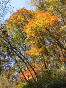 川の両岸に広がる紅葉は、ナラ、ウルシ、カエデなど。