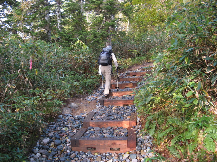 ぬかるんで滑りやすい道に、木組みと石の立派な階段が時折現れる。適度な段差で歩きやすかった。