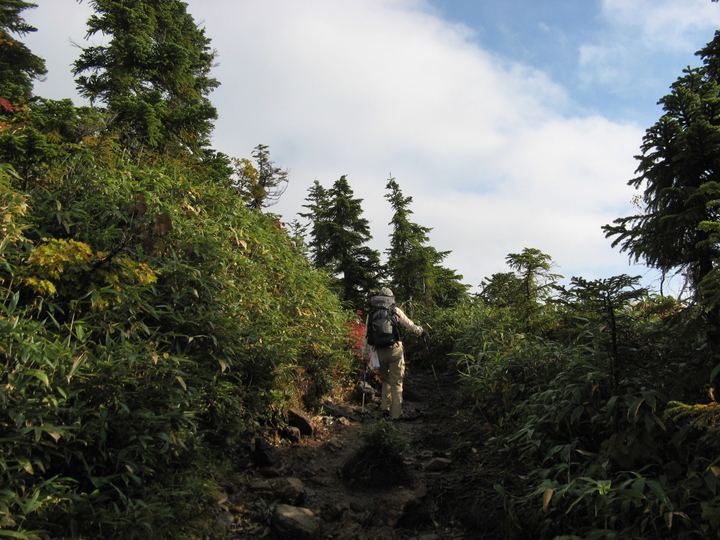山頂へ向かう道と迂回路との合流地点までゆるやかに上る。
