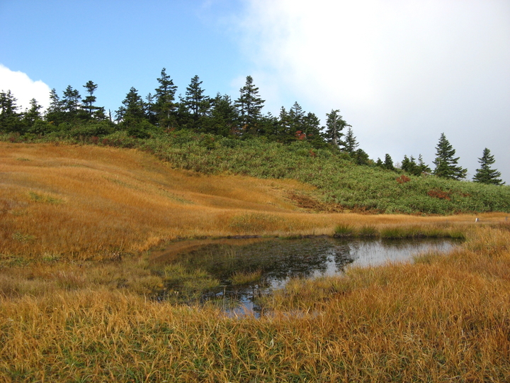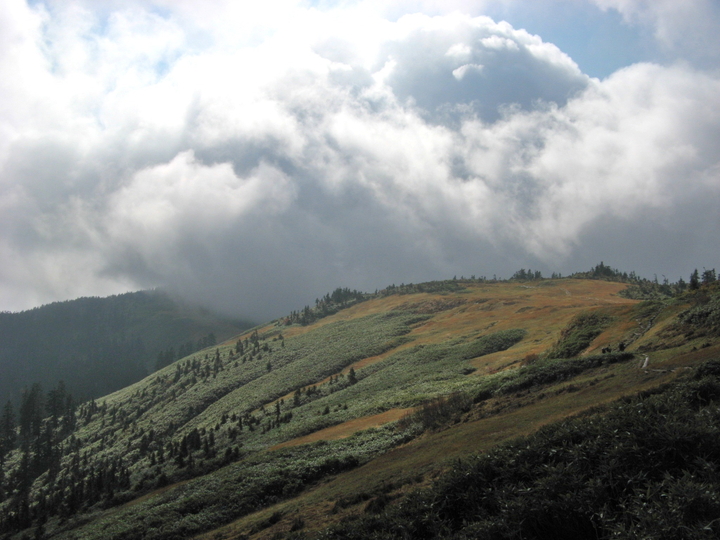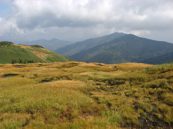 稜線を大きな積雲が通過して行った。2,000mの高層湿原にいることを実感。