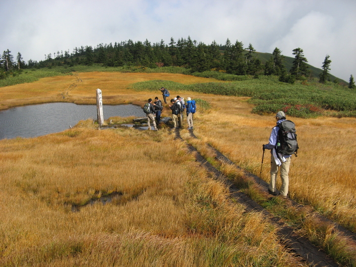 中門岳へ続く稜線には、草紅葉と池塘の美しい湿原が広がっていた。