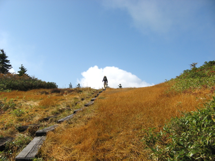 しばらく歩くと空が明るくなり、草紅葉の色合いが鮮やかさを増してきた。