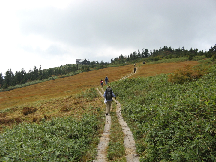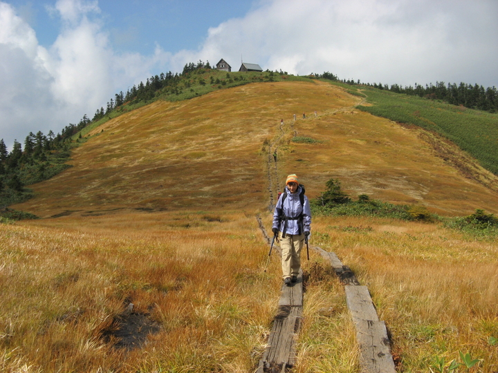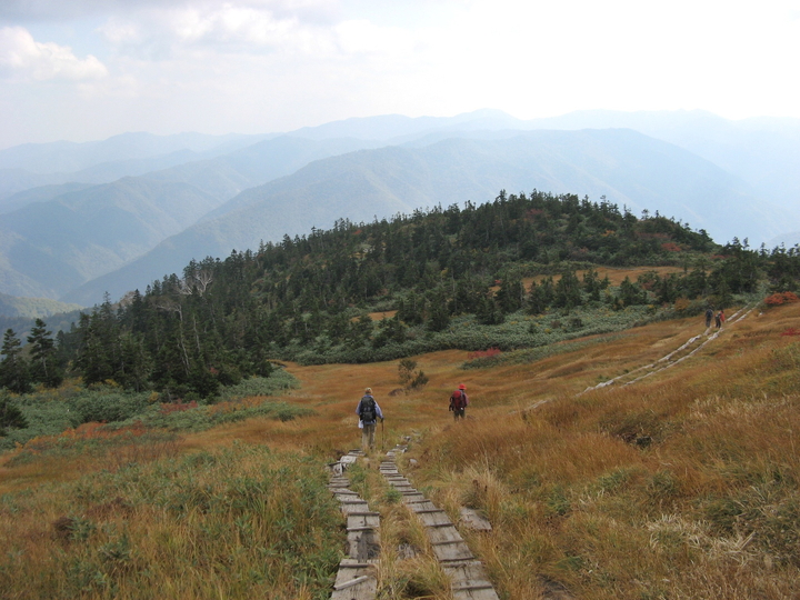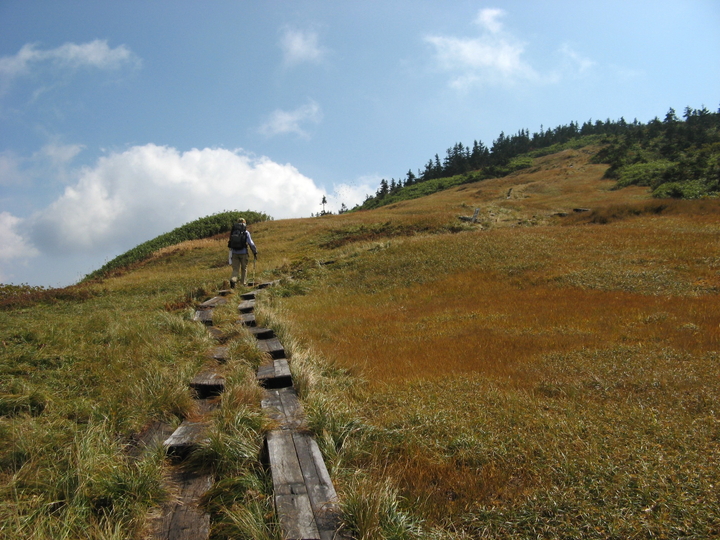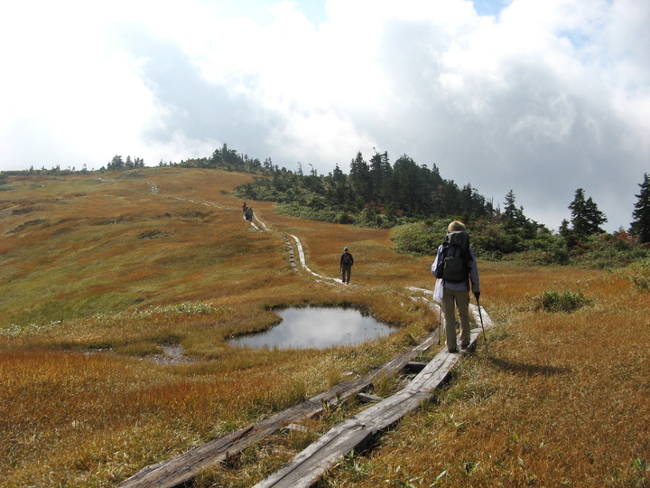 駒ノ小屋へ続く木道も、解放感抜群で心地よかった。この辺りからすれ違うハイカーがぐんと増えた。