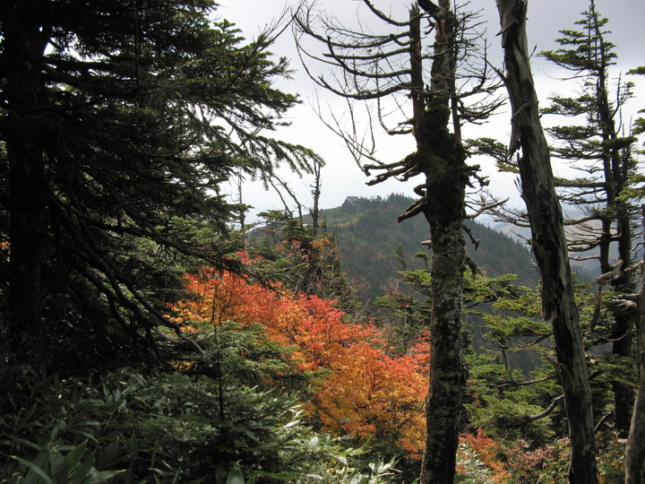 草が見事に紅葉していたが、あいにくのくもり空で霧も出てきた。