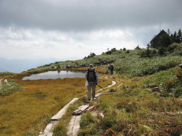 山頂へ続く階段の分岐を過ぎてしばらく進むと視界が開けた。駒ノ大池付近で、登山客が大勢休んでいるのが見えた。