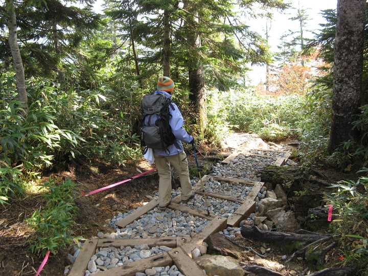 樹林帯の下りに入る。木枠と石の道は歩きやすいが、ドロドロの道も多かった。