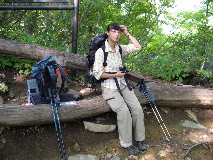 足に疲労を感じてきたので、倒木がちょうどよいベンチとなつた場所でしばし休憩。