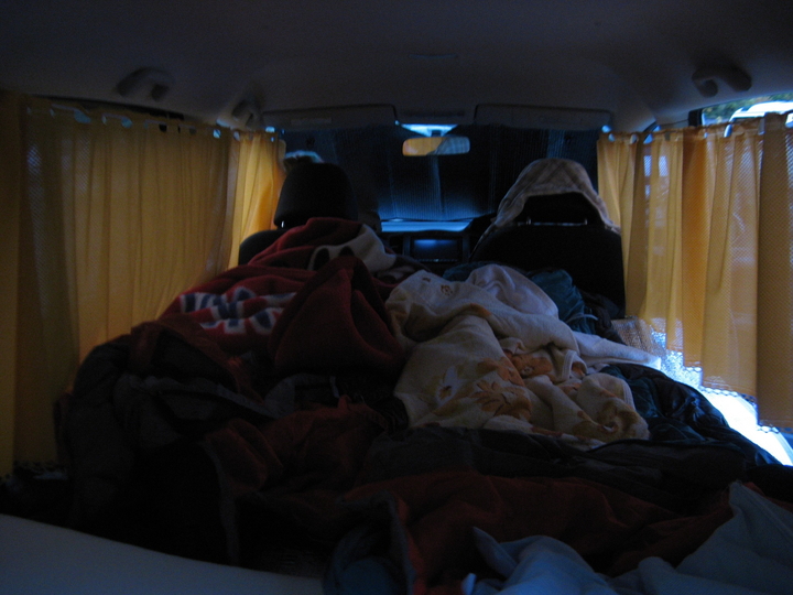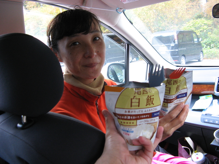 お湯を沸かして夕食の準備にかかる。場所がないので後部座席を利用。狭いが何とかなった。