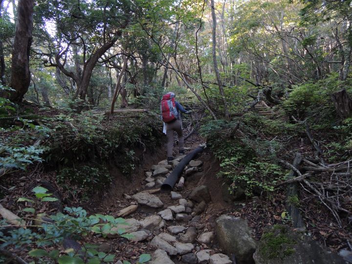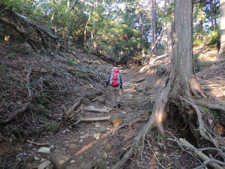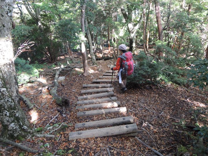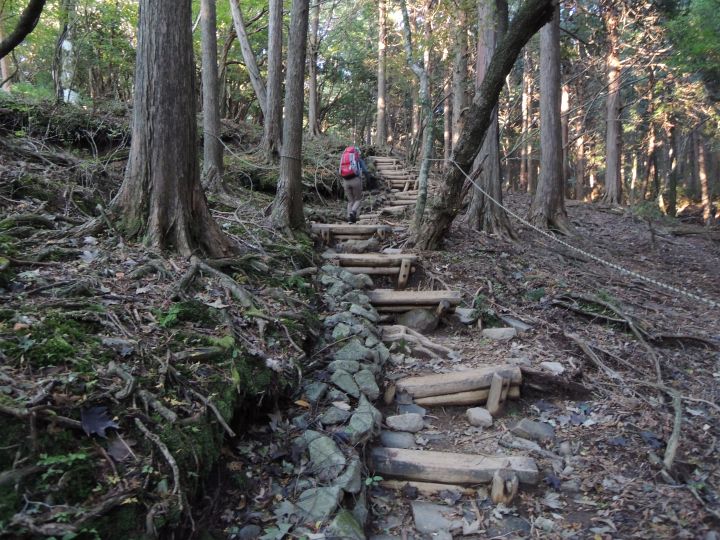 下の方の木段は間が削れて歩きづらくなっていた。
