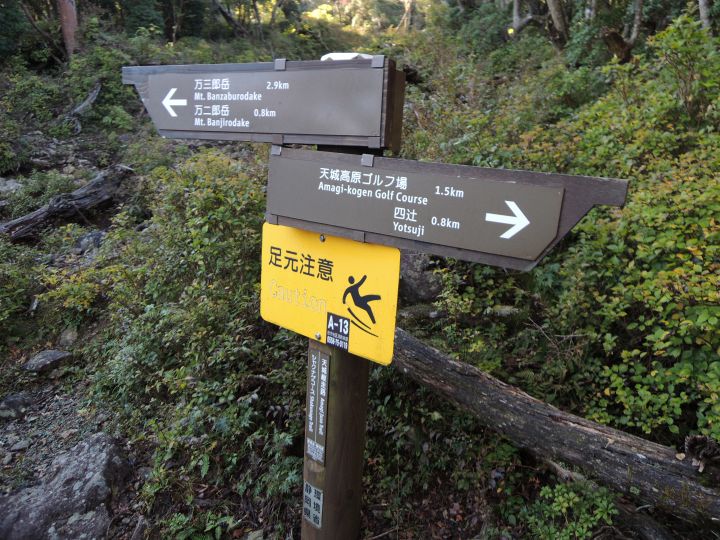 天城高原ゴルフ場P 6:40 ⇒ 四辻 7:00 ⇒ 7:50 万二郎岳 7:55 ⇒ 馬の背 8:10 ⇒ 石献立(はなだて) 8:30 ⇒ 9:00 万三郎岳 9:20 ⇒ 涸沢分岐点 10:00 ⇒ 11:00 四辻 11:05 ⇒ 天城高原ゴルフ場P 11:20