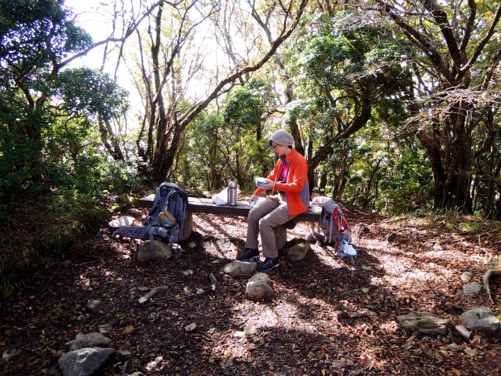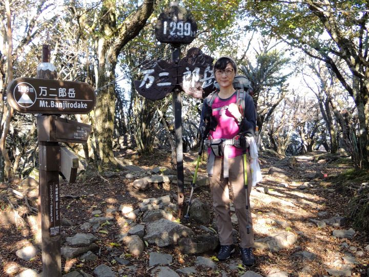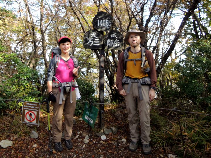 9:00 万三郎岳(1,406m)に到着。先客の老ハイカーが写真を撮ってくれたが、その方は熊野古道と四国お遍路をすべて踏破している壮健だった。