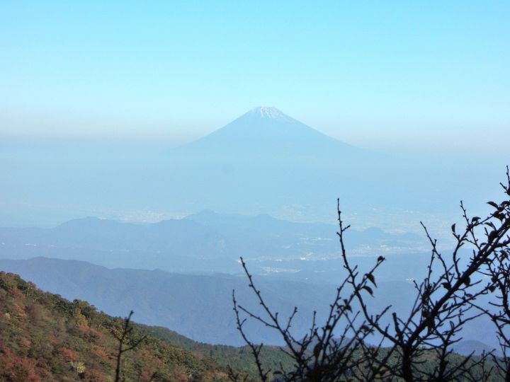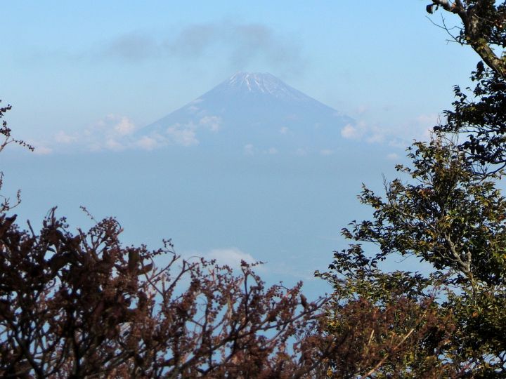 樹木の切れ間に富士山が見えた。クリアに富士山の見えるポイントを探しながら歩いたが、よい場所は見つからなかった。