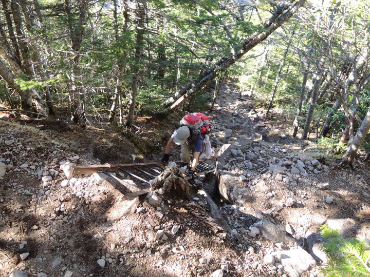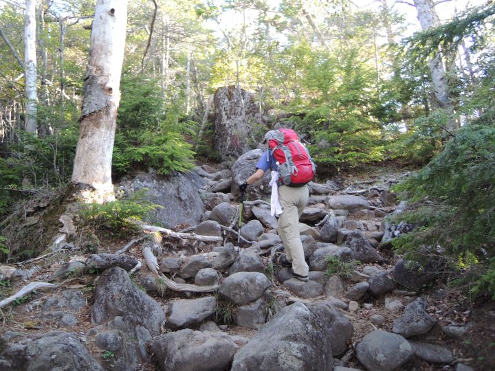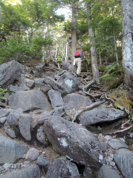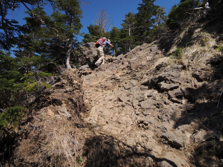 山頂直下は大きな岩ゴロの急登が続く。段差が大きいので大腿四頭筋の疲労が激しくなる。