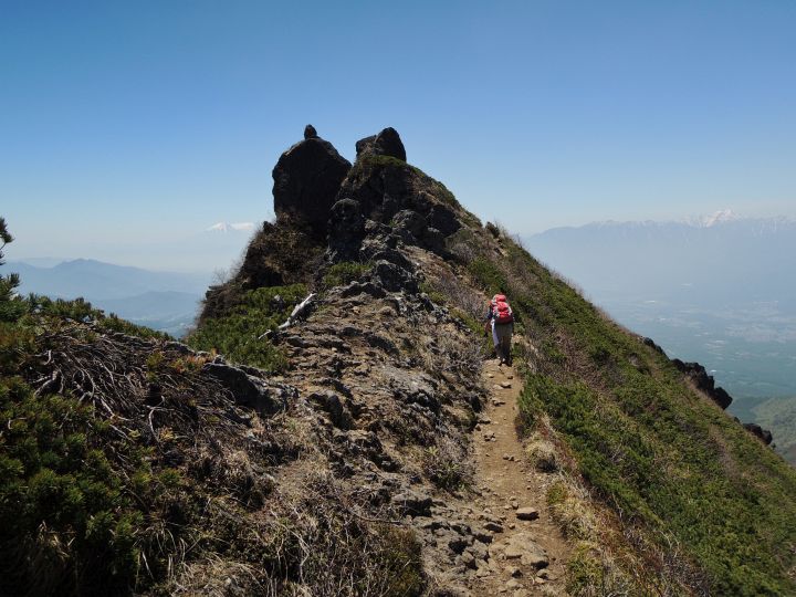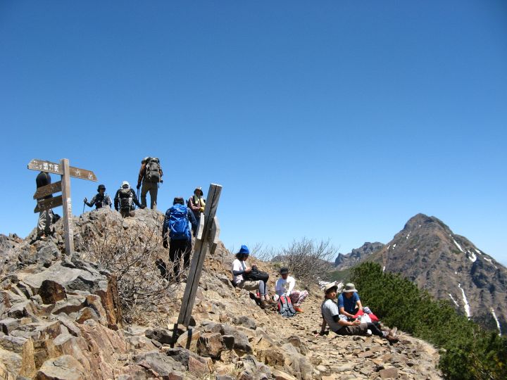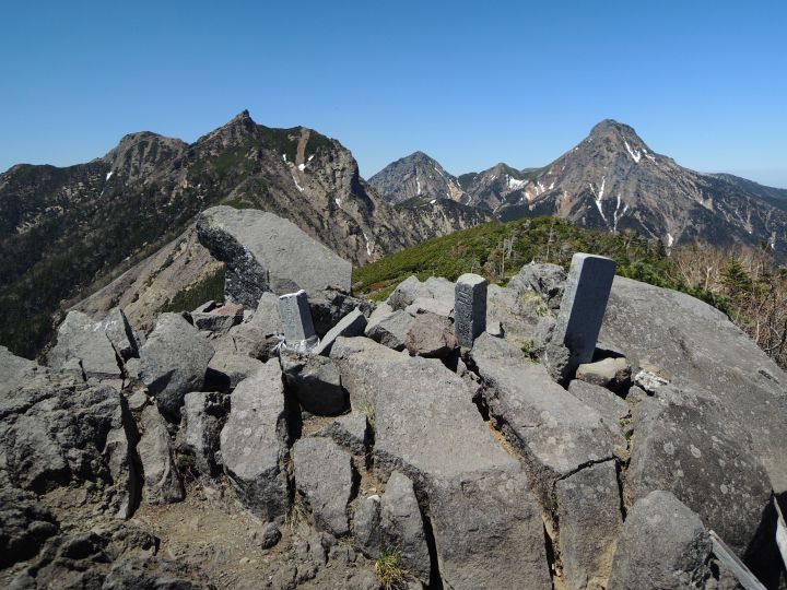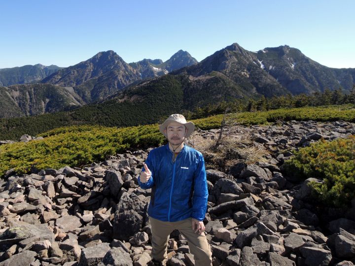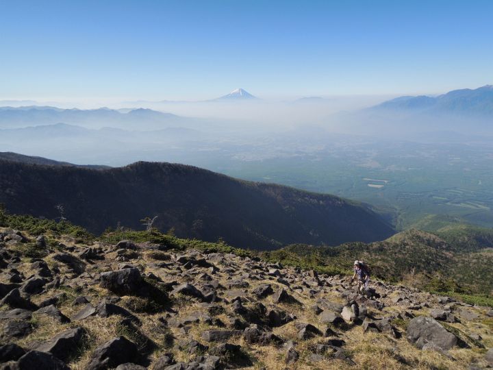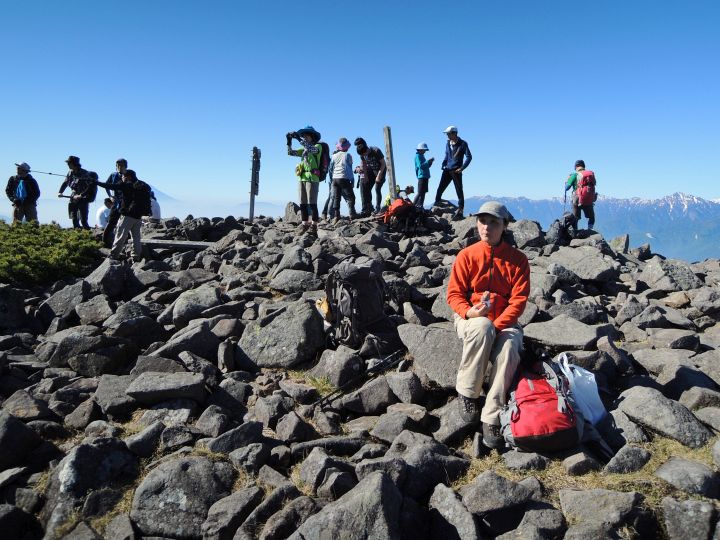 1時20分起床、1時50分出発。観音平には4時5分到着。期待した通りに朝から快晴で、富士山と南アルプスはもちろん、北アルプスから白山まで見えて、山頂から見えるべき山はすべて見えていた。最高の登山日和に山は多くのハイカーで賑わっており、我々と同じコースを周遊している人も多かった。4年前には疲労でほんの数メートル上るだけのギボシ山頂をパスした嫁も、今回は余裕をもって上っていた。岩場の写真を何度も撮り直すうちに時間は経過してしまったが、久しぶりに1時間以上山頂に滞在して、360度の大パノラマを心ゆくまで堪能した。前の週にロング縦走をしていたので体力的には余裕を感じていたが、下りでまた腰痛となり、最後はおっかなびっくり歩くことになってしまった。