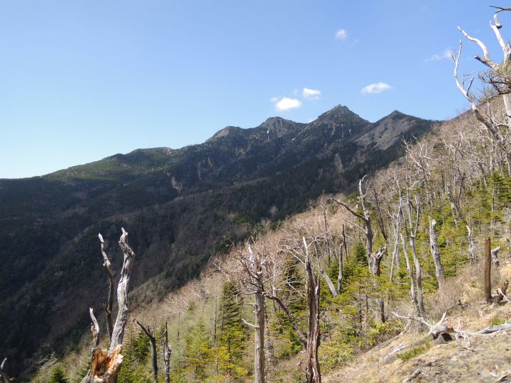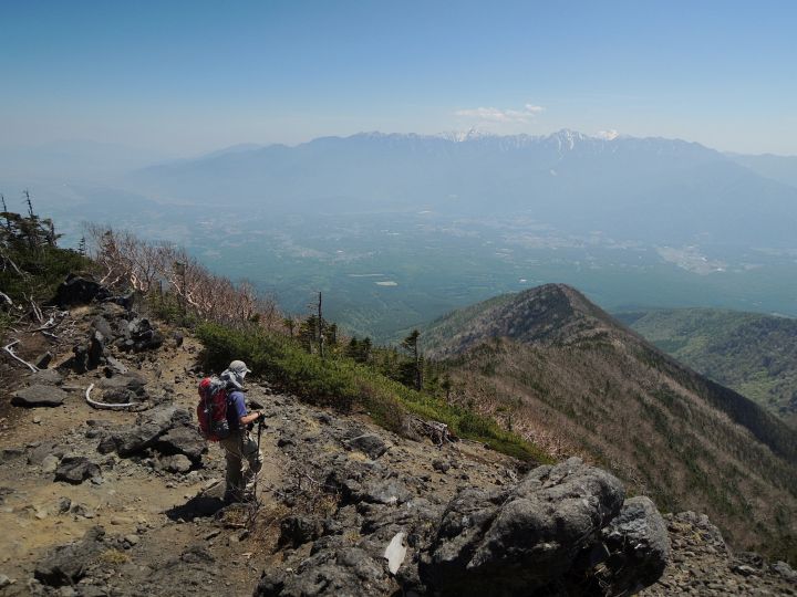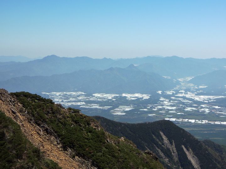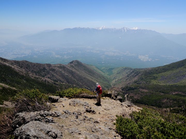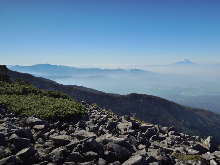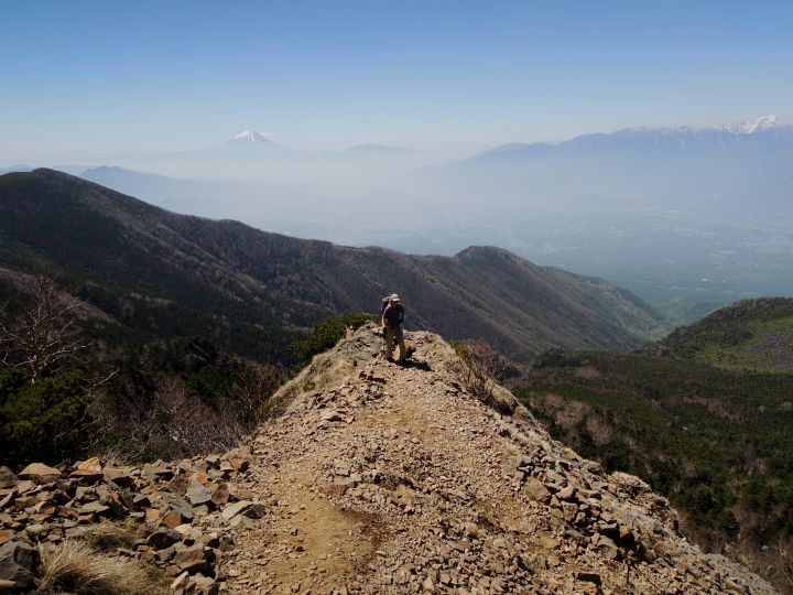 分岐までくると東側の眺めも一気に広がる。左に三宝山と甲武信ヶ岳、真ん中やや左には国師ヶ岳と金峰山、右には茅が岳も見える。