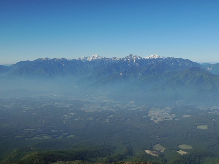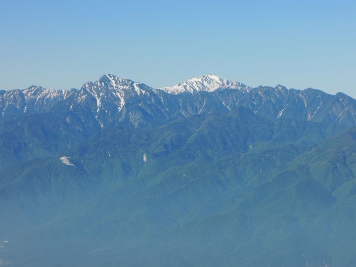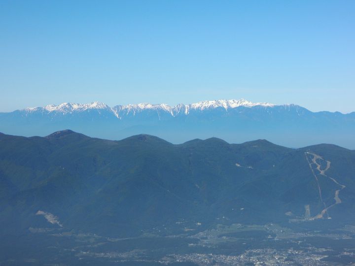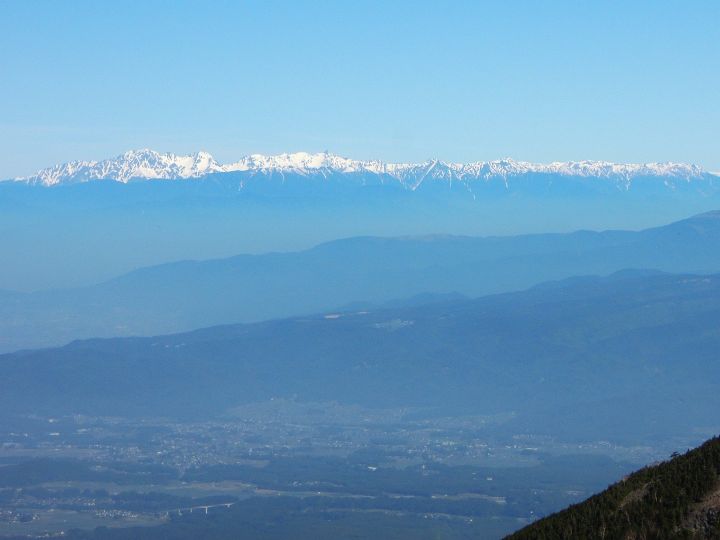 西には中央アルプス。左から南駒ヶ岳、空木岳、熊沢岳、檜尾岳、宝剣岳、木曽駒ヶ岳と続く。