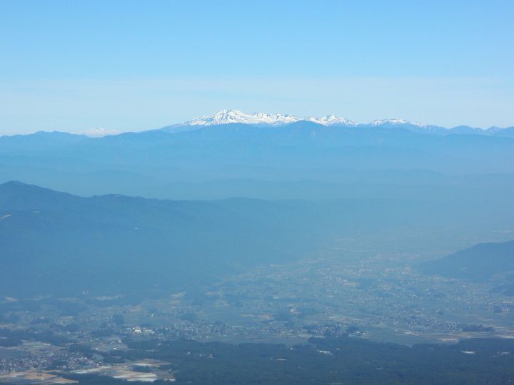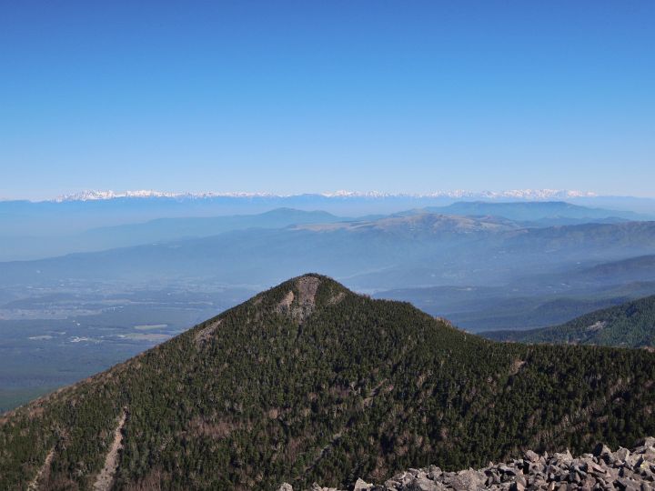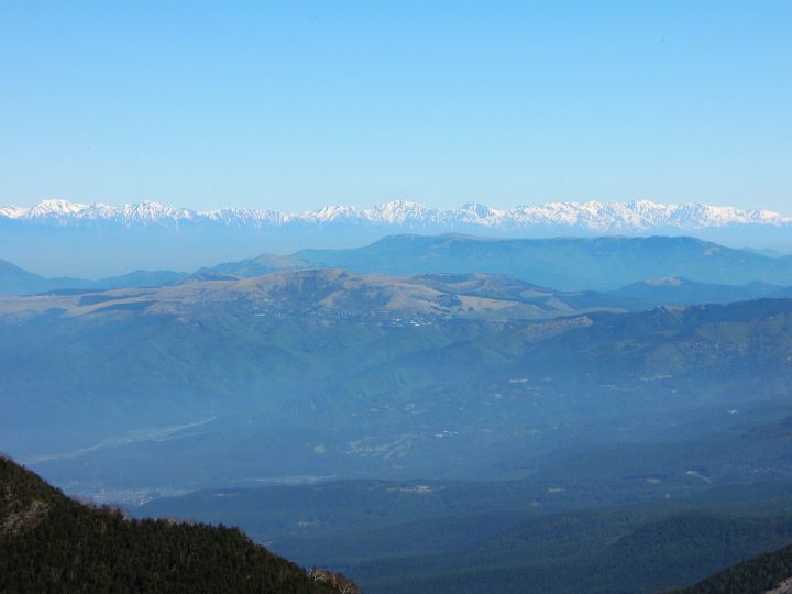 北西方向。西岳の向こうに北アルプスがずらりと並ぶ。