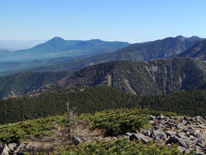 ギボシの頂は360度の大パノラマ。北を望むと、北八ヶ岳の上に高妻山、焼山、火打山、妙高山が並んで見えた。