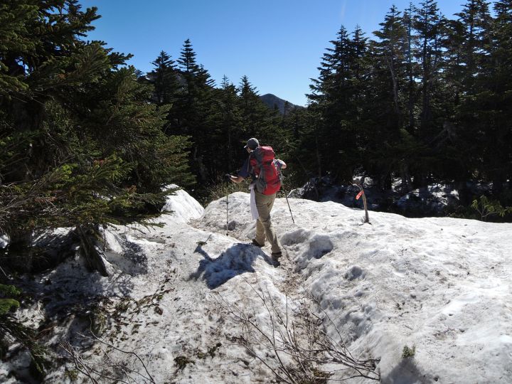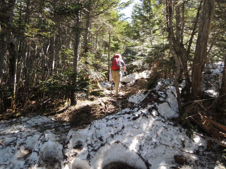 シラビソの樹林帯を上る。雪が少し残っていたが、踏み跡が階段のようになっていて歩きやすかった。