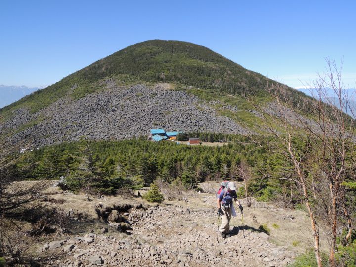 ハイマツ帯の向こうに青年小屋が見えてきた。その背後にはギボシと権現岳がそびえる。
