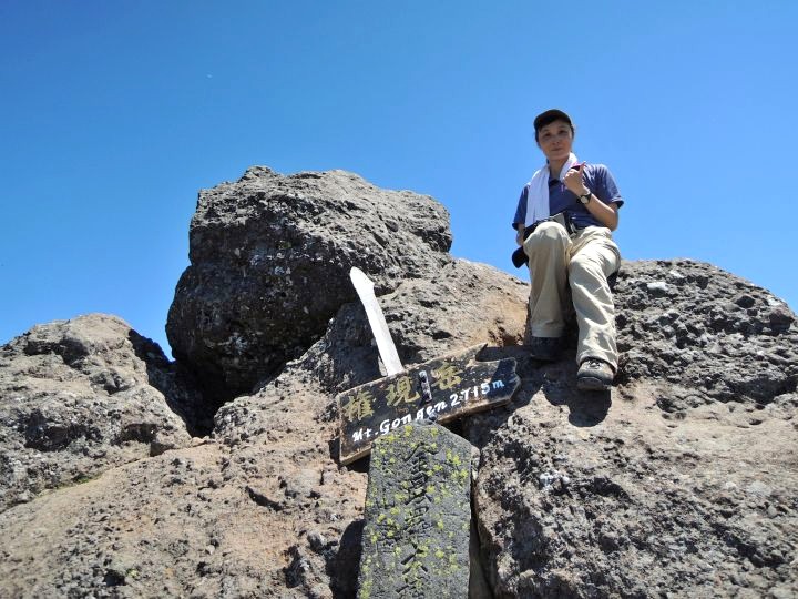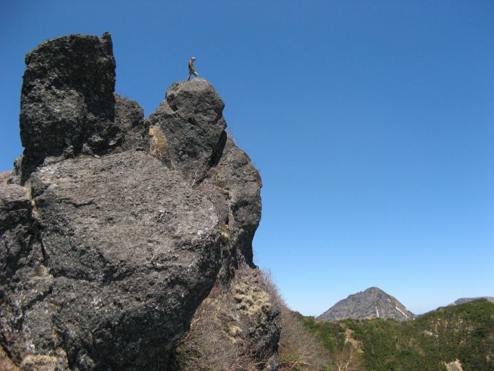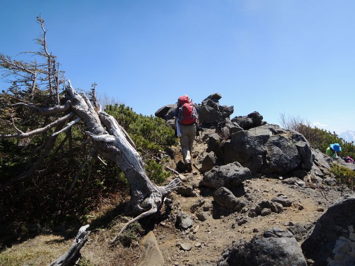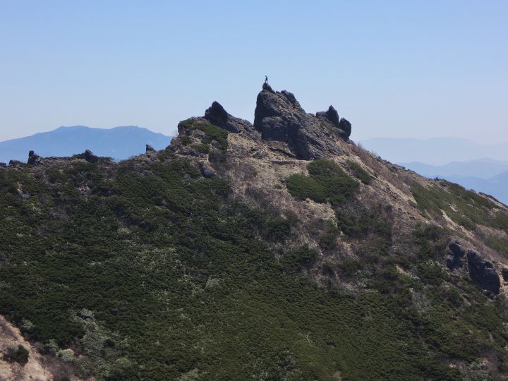 権現岳山頂の岩に登るハイカー。自分もあそこに登ろうと思いながら歩いた。
