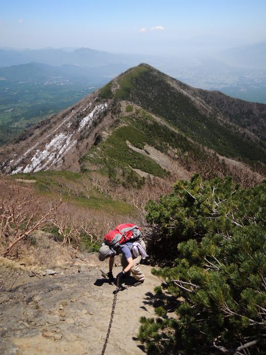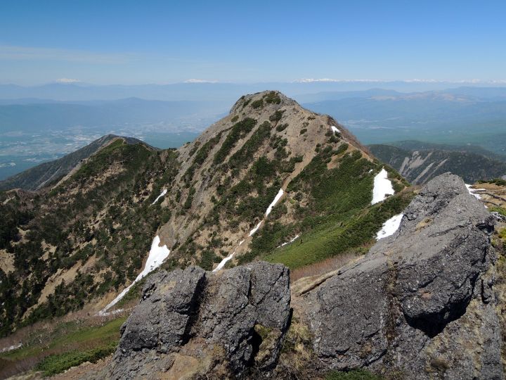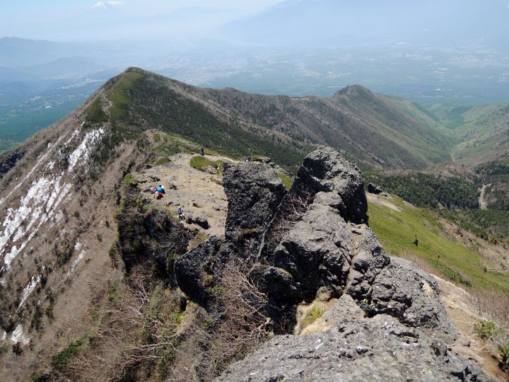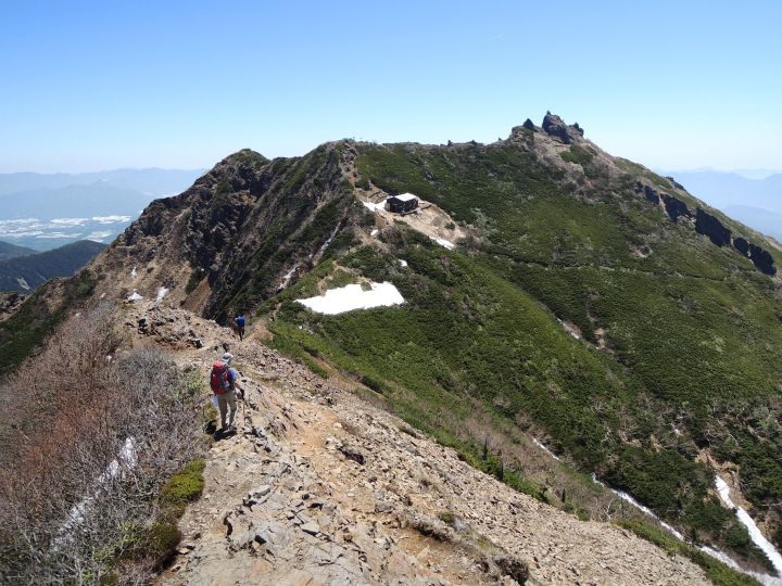 眼下を見下ろすと、肩で休む嫁と、三ツ頭から木戸口公園へ下る稜線が一望できた。