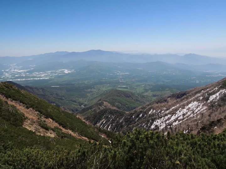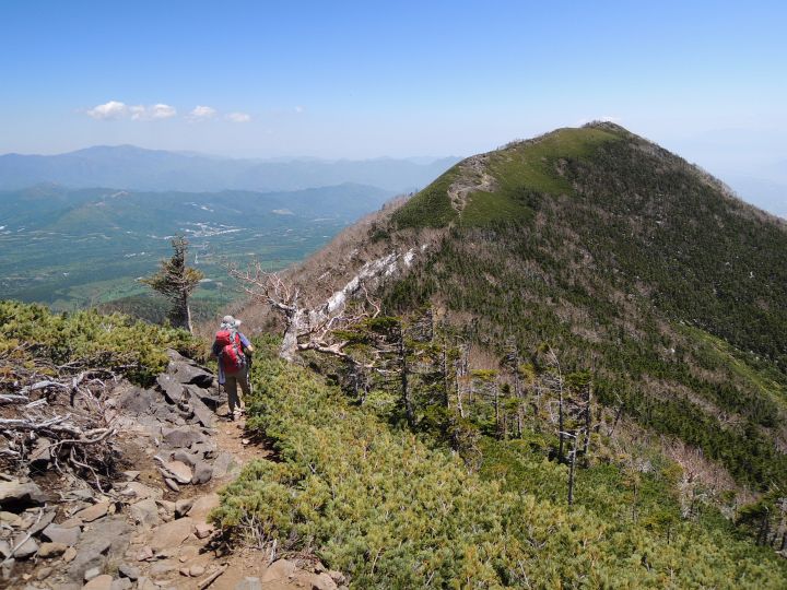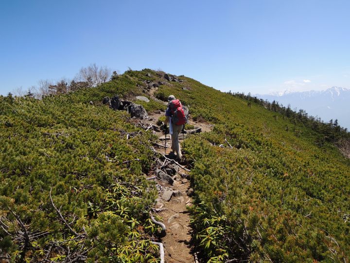 7:20 ハイマツなどの灌木帯を抜けると素晴らしい眺めが広がる。雲ひとつない青空にテンションが一気に上がった。