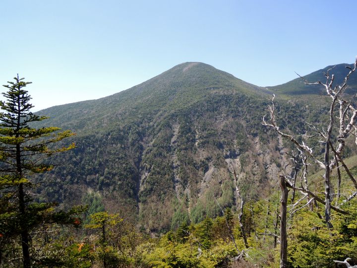 ひたすら下って振り返ると、権現岳とギボシが見えた。