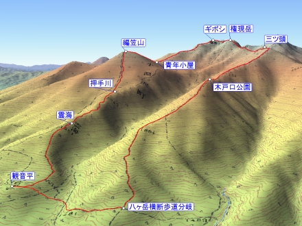 観音平 4:30 ⇒ 5:20 雲海 5:25 ⇒ 押手川 6:05 ⇒ (露岩で5分休憩) ⇒ 7:30 編笠山 8:10 ⇒ 8:40 青年小屋 8:45 ⇒ 9:20 のろし場 9:25 ⇒ 9:50 西ギボシ 10:00 ⇒ 10:15 ギボシ 10:25 ⇒ 10:40 権現岳分岐 10:45 ⇒ 10:50 権現岳 12:05 ⇒ 12:50 三ツ頭 12:55 ⇒ 木戸口公園 13:40 ⇒ (5分休憩) ⇒ 八ヶ岳横断歩道分岐 14:40 ⇒ 観音平 15:05