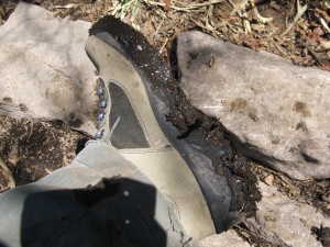 靴は泥まみれ。駐車場に着いてから、拾った木の枝で泥を落とした。